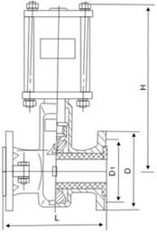 GJ641X氣動管夾閥由氣動裝置,左右閥體,橡膠管套、大小閥桿、上下閘板、導柱等零件組成。當順轉手輪時,使大小閥桿同時帶動上下閘板,壓縮管套,進行關閉,反轉即行開啟,這樣閘板在導柱之間上下往復完成閥門開閉工作。另外,因橡膠管套承力,因此在開關時,操作人員旋轉手輪時只要感到適量抵觸,均己達到開閉點,切勿盡力或多人輔助,禁用其他工具開閉。