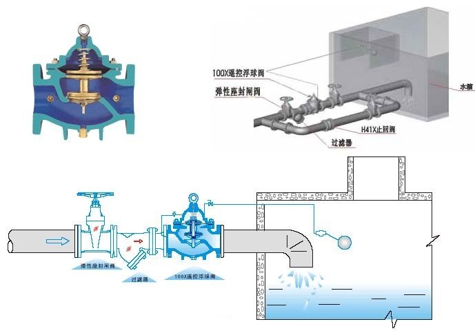 100X遙控浮球閥由主閥、針閥、球閥、浮球閥、微型過濾器等組成水力控制接管系統(tǒng),調(diào)定后,自動(dòng)控制液面高度。